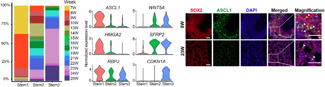 首先,研究人员对分子特征尚未研究清楚的人类垂体干细胞进行亚群特征鉴定,发现干细胞亚群随发育时间变化,早期干细胞增殖能力较强,且高表达垂体所有激素细胞分化必需的转录因子ASCL1,该基因对于早期干细胞分化可能发挥了重要作用。晚期干细胞增殖能力被抑制,且高表达WNT信号调节因子SFRP2和WNT5A。