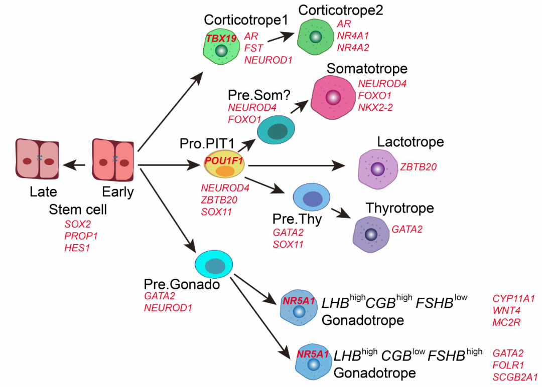 促性腺激素细胞呈现出起始时间不同的两个发育轨迹,其中表达灵长类特有的绒毛膜促性腺激素(CGB)的谱系起始于早期,对人类早期下丘脑 -垂体 -性腺轴 (HPG轴)的发育可能具有关键调控作用,而小鼠模型中并没有表达CGB的细胞亚型;高表达促卵泡激素(FSH)的亚型则起始于晚期。