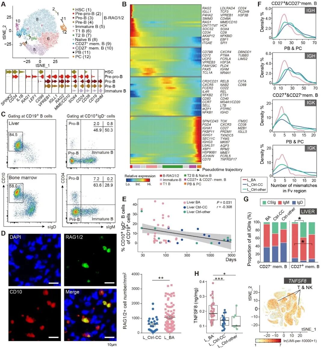 此外,尽管发育中的CD10+ B细胞的比率随着年龄增长而下降,但至少在出生后的4个月内仍持续着B细胞生成 (图2E)。对人类骨髓B细胞的研究表明,大多数前体细胞和未成熟B细胞具有自身反应性B细胞受体(BCR)。这些B细胞出骨髓到外周系统需要清除高自身亲和力的BCR,这一过程被称为中枢耐受【1】。研究者认为肝脏B细胞的耐受性缺失可能是导致BA肝脏损伤的重要原因。通过一系列分析,发现BA患儿的记忆 B细胞、浆母细胞和浆细胞的BCR具有自身反应性的特征,并且它们的Ig 类型转换也明显受到抑制(图2F-G)。通过免疫球蛋白浓度的测量证实BA患者肝脏具有保护性质的 IgM特异性自身抗体浓度降低,而具有损伤作用的IgG特异性自身抗体浓度升高,并且患者无黄疸的存活时间与IgM/IgG4比值有正相关关系。