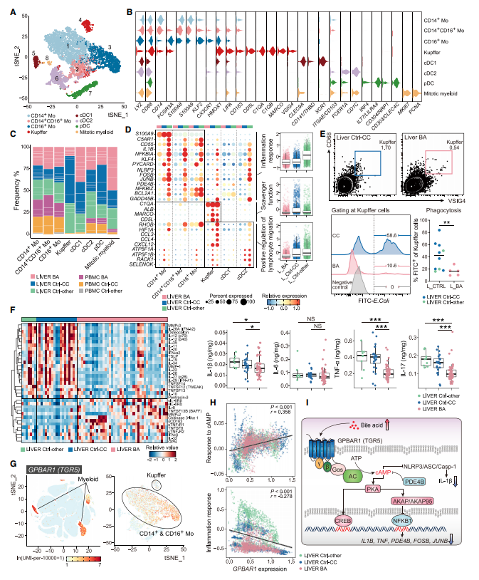 研究者通过单细胞转录组以及实验室检测比较肝活检样本匀浆中细胞因子的浓度,发现BA患者肝内髓系细胞的炎症反应和趋化作用被明显抑制(图3D 和F),此外,BA患者Kupffer的清道夫功能显著受损 (图3E)。已有的报道显示胆汁酸通过细胞表面受体TGR5(由GPBAR1编码)以环状AMP(cAMP)-蛋白激酶A(PKA)依赖性方式抑制巨噬细胞的炎症、趋化性和吞噬功能,因此研究者探讨了胆汁酸在BA患儿肝脏髓系细胞功能障碍产生中的贡献 (图3G和I)。通过表达相关性分析,研究者证实GPBAR1表达与cAMP信号传导正相关,这导致炎症基因的表达抑制 (图3H)。因此,BA肝脏髓系细胞的低炎症状态可能是由胆汁酸在肝脏的积累导致的。