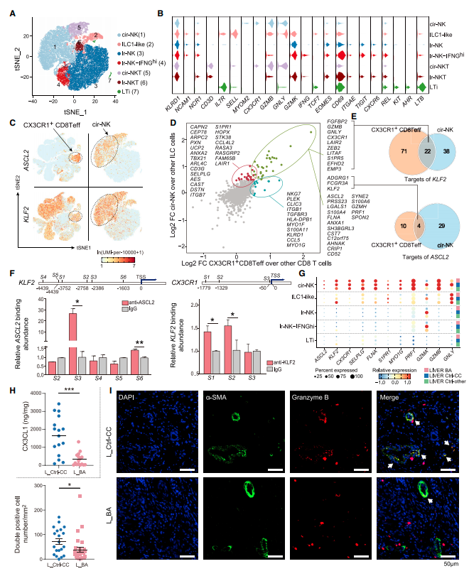 CX3CR1+循环NK细胞(cir-NK)和循环NKT细胞(cir-NKT)在BA患儿肝脏内的比率也显著降低。CX3CR1+ T和NK细胞都高表达编码促进细胞迁移以及与非淋巴细胞相互作用的基因;转录因子分析揭示CX3CR1+ T和NK细胞内兼具有高ASCL2和KLF2的转录活性,且它们的靶基因富集在参与细胞迁移和胶原结合的通路上(图4C-E)。实验证实ASCL2可结合在KLF2的启动子,而KLF2可结合在CX3CR1的启动子(图4F),提示ASCL2-KLF2-CX3CR1轴调控CX3CR1+T和NK细胞CX3CR1的表达和功能。