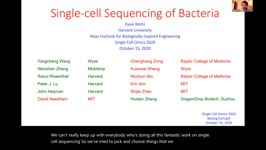 来自哈佛大学的David A. Weitz 教授介绍了其团队利用微流控液滴技术对微生物单细胞进行转录组和基因组测序的最新工作。微生物群体数量庞大,我们对其种类了解还缺乏详尽的了解。单细胞微生物测序是发现微生物新物种的有效工具,并且微流控液滴技术可以显著提高单细胞测序的通量和效率。Weitz教授首先介绍了利用N6随机引物代替polyT引物来进行反转录以及去除核糖体RNA这两个单细胞微流控液滴RNA测序技术的改进,从而解决了微生物RNA没有polyA,无法进行单细胞微流控液滴RNA测序这一问题。Weitz实验室还利用微流控液滴开发了Microbe-seq方法对单个微生物细胞基因组进行测序。Microbe-seq方法的亮点在于应用了两次微流控液滴融合的技术,把单个细菌细胞裂解液、下游扩增建库反应液以及带有编码引物序列的微球混合,从而实现对每个单细胞的编码。最后Weitz教授介绍了利用Microbe-seq方法的高灵敏度可以成功检测到在人体肠道菌群内新的微生物族群。