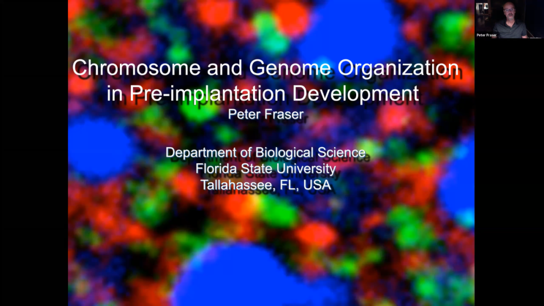来自佛罗里达州立大学的Perter Fraser教授首先介绍了他们过去几年发展的单细胞Hi-C技术和基于分子动力学模拟的染色质重构方法,在2017年他用此方法研究了染色质结构随细胞周期变化,根据相互作用的模式对细胞进行细胞周期排序。他接着讲述了最近用单细胞Hi-C研究小鼠着床前胚胎发育的工作,展示了不同发育阶段胚胎细胞周期分布的结果。通过使用谢晓亮课题组2018年发表的Dip-C算法,他重构了发育过程中二倍体细胞的结构。他首先观测了父母源染色体体积随发育阶段的变化,随后分析了染色体间相互作用模式,发现在一细胞期父母源染色体完全分离,在二细胞期父母源染色体呈现出半球分布。在四细胞时期大部分M期细胞都存在同源染色体配对的情况,分析表明可能是一种基因组自我检查机制。